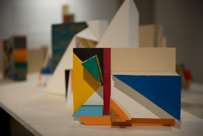 “The next one I am gonna start is with a chainsaw…I’ve never chainsawed paper but that’s not a bad idea.” Those are the last lines of a video made by Winooski documentarian Dan Higgins during a visit to Edwin Owre’s studio in December 2011. Owre’s comments speak to his particular brand of artmaking: an experimental approach to materials, a disdain for “fussiness”, and a willingness to “give it a go” and see what happens. Architect David Sellers cites Owre as instrumental in establishing a movement of design/build in which artists and sculptors and architects design and build things in the process of making something. But the cavalier buoyancy with which Owre’s approaches artmaking is tempered by a keen ability to react and respond to movements in art. Owre’s fluency with color, shape, and composition pours out of the constructions on view at the BCA Center this past winter, and, if I may be so bold, suggest that Owre is doing with landscape painting what John Chamberlain did with abstract expressionism. He is bringing it into the third dimension.