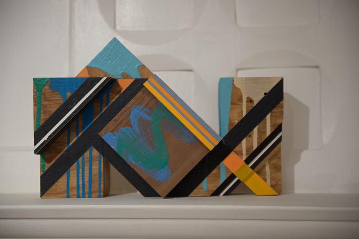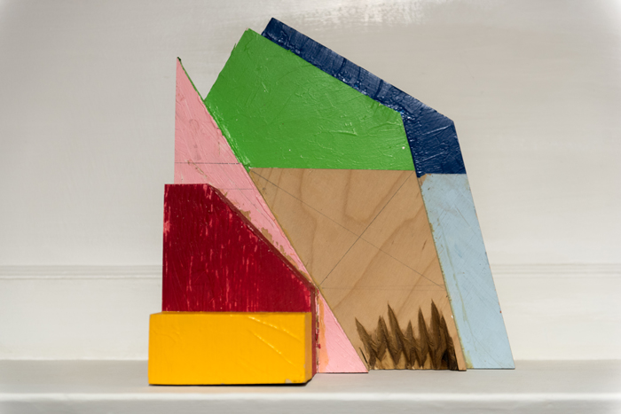 Brightly colored fragments of plywood are assembled into fields. Barometer of Mercies, with its zig-zag geometries and rambling blue shapes evoke the sky. Intersecting white rectangles of Cross Talk and a suggestive orange dotted line propose an aerial view of a cityscape. How can one not see the mountain in Fleurs du Mal? Standing works use the tabletop as a horizon and rise up from the surface like buildings in a fantastical city. Pinks, blues, and orange hues reflect the palette of today’s painters who see not only green and brown but a blazing range of colors in the atmosphere. At various times, in these works, the paint crosses and combines genres. Raw wood contrasts with refined, smooth surfaces. Thick lines of red, white, and yellow break up luscious fields of swirled paint.