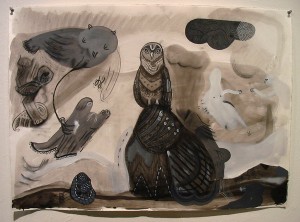 Owls are a re-occuring image in Alex Costantino’s work. The symbol provides the artist with fertile ground. An icon of wisdom and strength and a brutal, nocturnal hunter, the owl is at times mysterious link to mystical terrain and at other times a connection to the natural world. Depending on the context, it can be a symbol of the id, the ego, or the superego. Costantino uses the owl to explore his own psyche while making work that the viewer is able to access for themselves.