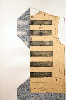 In this current body of work on paper: clothing patterns, ink, pencil, paint, crayon, printed shelf liner and other faux surfaces are used to create minimal geometric constructions of structures, landscapes and angular human forms to explore ideas related to man and the surroundings that can define him.