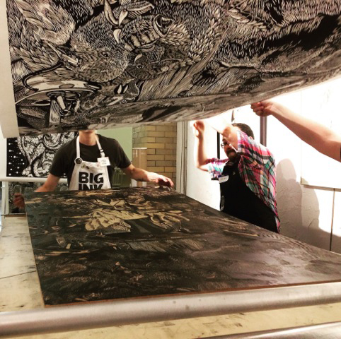 Two Rivers Printmaking Studio is partnering with Big Ink for a one-day, large woodcut printing community event and demonstration. Using Big Ink’s giant mobile etching press, they will be pulling prints up to 40″x96″.