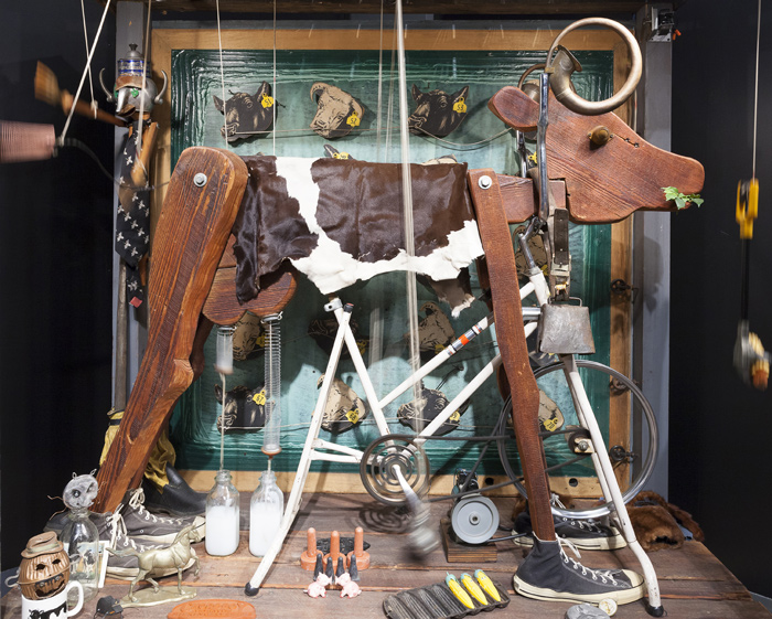 “Best of ‘Springs, Sprockets & Pulleys'” marks the return to Brattleboro of artist Steve Gerberich’s zany interactive sculptures. BMAC exhibited “Gerb’s Gadgetry” in 2011, and, according to Director Danny Lichtenfeld it was one of the museum’s most popular exhibits in recent memory. For his latest installation, Gerberich has cleverly assembled a hodge-podge of everyday materials (kitchen utensils, furniture scraps, and discarded toys) into elaborate clanking, whirring, buzzing sculptures, which will be installed throughout the museum’s Wolf Kahn & Emily Mason Gallery. Gerberich will lead a guided tour of the exhibit on Sunday, June 17 at 2PM. (image: Cash Cow by Steve Gerberich)