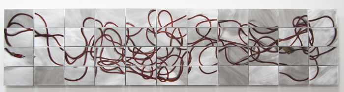 The Scarf, a new work funded in part by a grant from the Vermont Community Foundation’s Vermont Arts Endowment Fund, comprises photographs, video, and a giant scarf fashioned out of bright orange industrial extension cords. Draped over a ladder and extending onto the gallery floor, the eponymous scarf is anything but warm and comforting. On the gallery walls behind it are a video depicting hands knitting the curious object and a large photograph of a tattered extension cord, printed on one-foot-square panels of brushed and burnished aluminum.