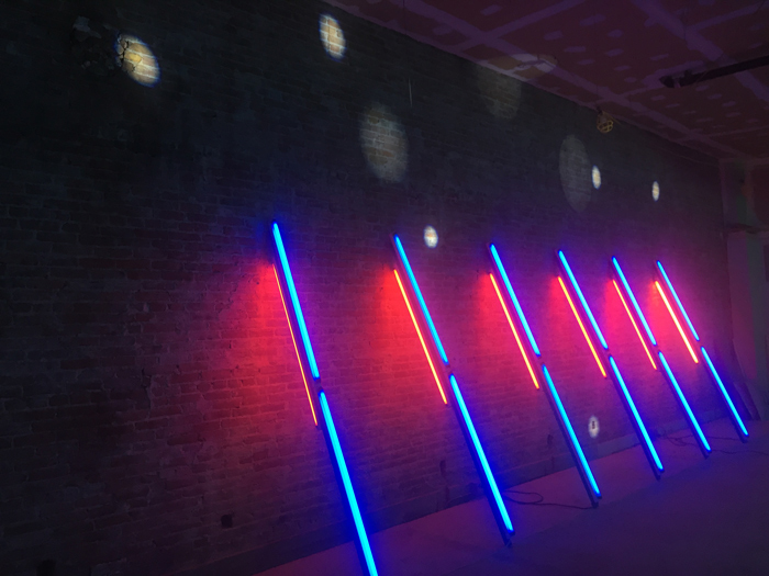 Jeffrey utilizes fluorescent lights to construct sculptural installations and environments that explore light, color, and architecture. A stained glass artist by trade, Jeffrey evokes spaces associated with the otherworldly (dreams, chapels, etc.) to ignite otherwise dormant interiors with a lively yet mysterious quality.