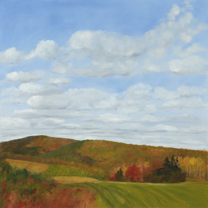 Putney artist Nancy Calicchio is the featured artist at City Hall Gallery, curated by BCA, on the Church Street Marketplace. Calicchio says about her work: In my paintings, I seek to capture the great beauty of Vermont’s landscape. My paintings reveal both my fascination with the natural world–sky, mountains, hills, brooks and streams, trees and fields–and my interest in working farms. Painting outside in every season is a way of probing this world, of engaging all my senses in the scene. When I set up my easel I search for the play of light, for it is light and shadow that shape the form and light that reveals the color. I feel that when I am truly engaged in what I am painting, I become part of it. It is my greatest desire that this feeling will resonate through the painting to the viewer and bring to life the beauty and joy of our landscape. Calicchio is also the cover artist for the September 2017 issue of Art Map Burlington. (image: Over the Orchard in Fall by Nancy Calicchio (36″x36″; oil on canvas))