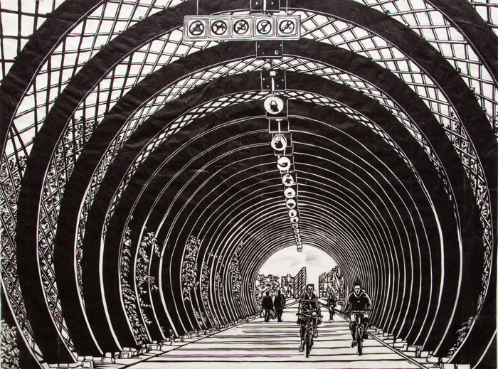 Nori Pepe’s work, “Carving out a Place”, are black-and-white unframed linocuts based on her travels to Venice, Moscow, and more.