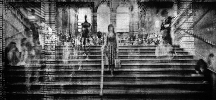 Schaub’s most recent series, “Motion Pictures”, a monumental series of figures in both land- and cityscapes are on display at the fair. Schaub describes these panoramic works as “in-camera collage on film”, and range from seven to fourteen feet in length. All featured works are printed on handmade papers and wood veneer.