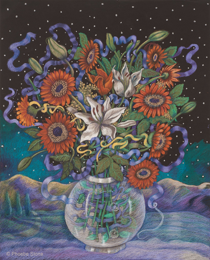 Located in the lobby of the Castleton Fine Arts Center, the gallery showcases Rutland-area and regional artists year-round. Through 3/31/2017: “Still Life with Universe.” Phoebe Stone’s new large format pastels and oils revolving around the subject of still life, everyday life and our mysterious relationship with the universe. In the Vermont Times, Dwight Garner wrote, “Phoebe Stone’s best work, and that’s just about all of it, has a restless logic and a soul that’s lit by refracted Moon glow. Her bright, playful, self-referential paintings are enormously captivating without ever seeming glib or forced. She’s one of the largest talents now at work in Vermont.” (image: Bouquet with Night Sky 3 by Phoebe Stone)