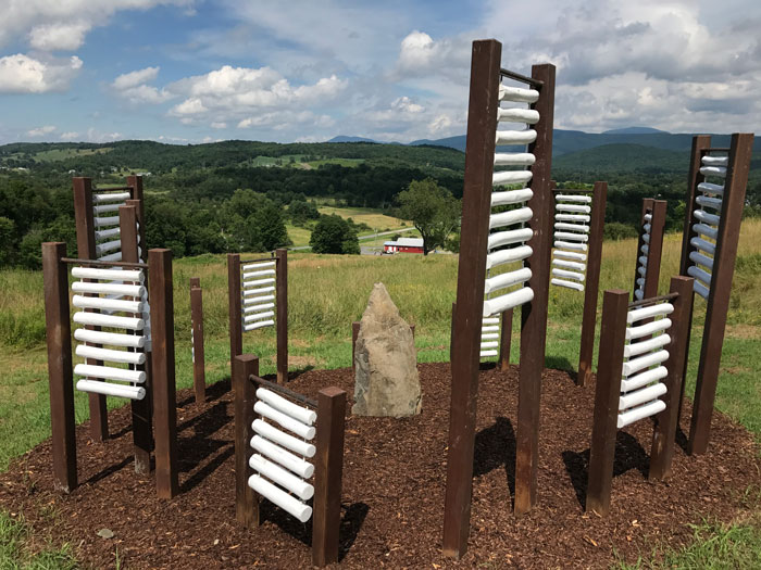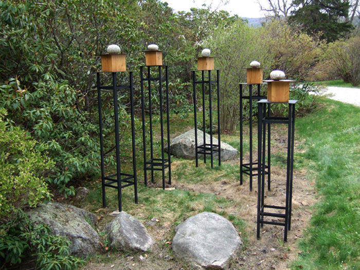 Stone and wood speak for the physical world while rusted steel addresses human abuse of the environment. Tree sections make nests for wild turkey eggs…a place of shelter and harmony. Through my work these conditions come together in a conversation of peace and spiritual quiet.