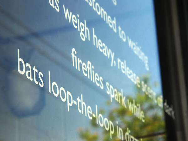 “the looking, on glass” is a series of four vinyl installations on storefront windows, which displays poetic excerpts from four different writers. Artist and writer Shannon Schmidt paired each storefront window with a writer’s work, arranging individual pieces that connect text to site. The excerpt from Windows, night by m. pinchuk glides from a window of Shaw’s General Store toward foliage, speaking ephemerally of the unseen; Alisha Laramee’s excerpt from Lies, Fairytales and Nightmares spans across a window of the Body Lounge, addressing the politics of migrant farm laborers; Julia Shipley explores the existential nature of movement from sky to earth in her excerpt from o on the window of Bear Pond Books; and at Black Cap Coffee Shop, Shannon Schmidt’s excerpt from Lady M. intersects with spectacles of newlyweds and Sunday’s best, while remarking on a passionate vigilance.